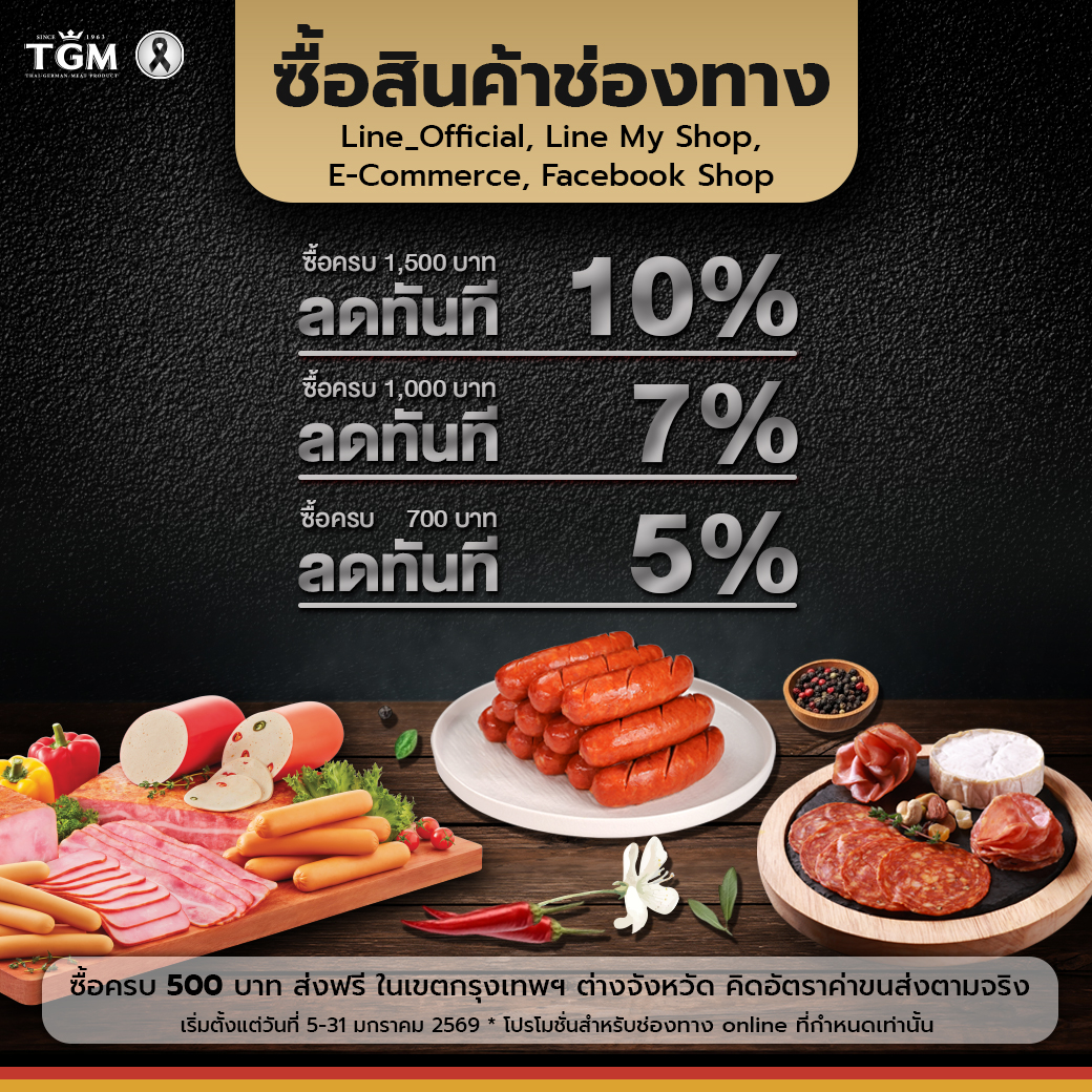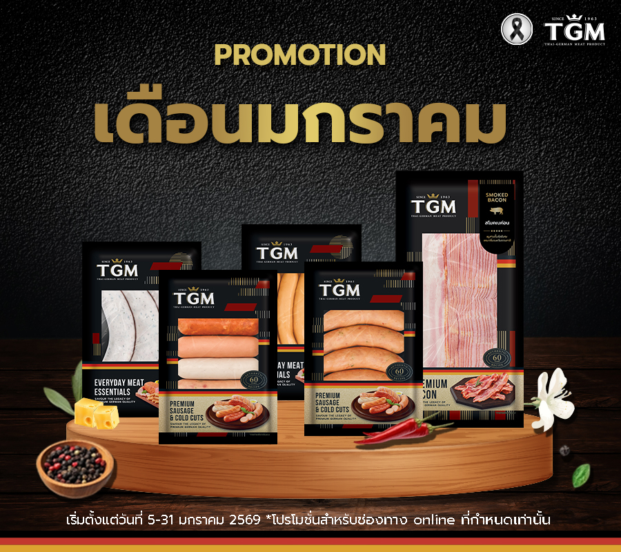 คุ้ม ครบ จบในที่เดียว! รวมโปรโมชันของอร่อย TGM ราคาพิเศษประจำมกราคม สั่งออนไลน์รอรับที่บ้านได้เลย! จะเมนูไหนก็ฟินได้ไม่ซ้ำ! ? TGM ขนกองทัพไส้กรอกและเบค่อนพรีเมียม มาลดราคาพิเศษต้อนรับปีใหม่ เลือกตัวที่ใช่แล้วกดใส่ตะกร้าด่วน! ?ชี้เป้า! +ไส้กรอกพริกชูบริค 500 กรัม ราคาพิเศษเพียง ฿199.- +ไส้กรอกชีสกลิ่นเห็ดทรัฟเฟิล 300 กรัม ราคาพิเศษเพียง ฿135.- + มิกซ์กริลล์ซอสเซส 300 กรัม ราคาพิเศษเพียง ฿123.- + สโมคเบค่อน (คัดพิเศษ) 500 กรัม ราคาพิเศษเพียง ฿299.- + ไส้กรอกเวียนนาไก่ TGM 500 กรัม ราคาพิเศษเพียง ฿229.- ดูเพิ่มเติม