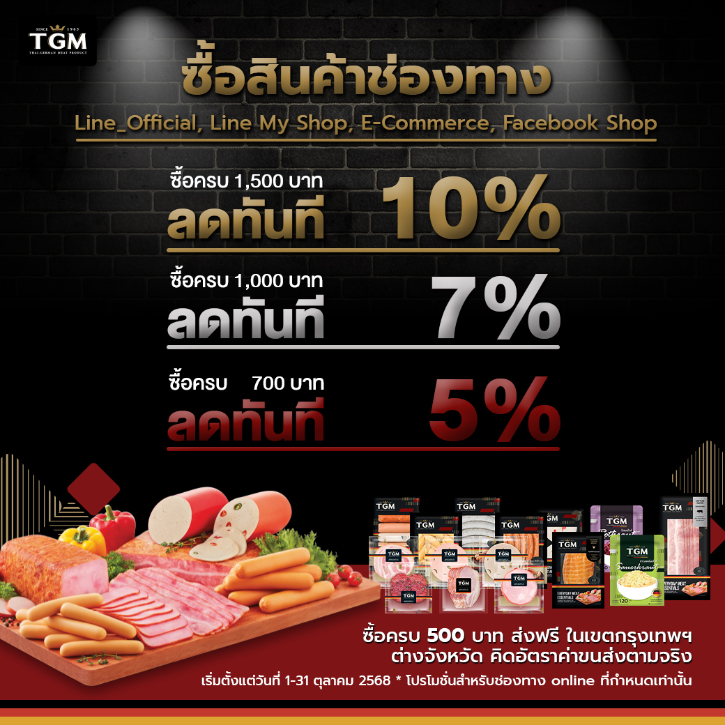 โปรโมชันเดือนตุลาคม 2568 TGM จัดโปรฉลองเดือนตุลาคม ลดเลย 5-10% ! คุ้มมากแม่!รายการส่วนลดพิเศษ: • ซื้อครบ 700 บาท ลดทันที 5% • ซื้อครบ 1,000 บาท ลดทันที 7% • ซื้อครบ 1,500 บาท ลดทันที 10%ใช้ได้กับ สินค้าราคาปกติ + สินค้าราคาโปรโมชันซื้อรวมกันได้เลย! ดูเพิ่มเติม